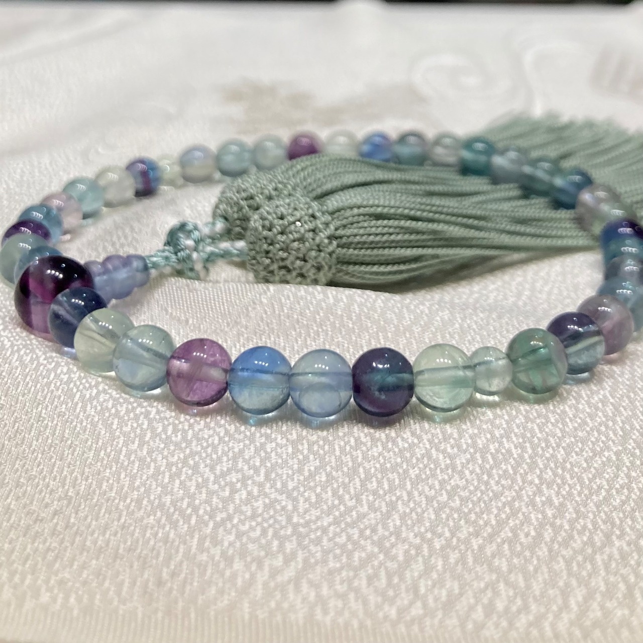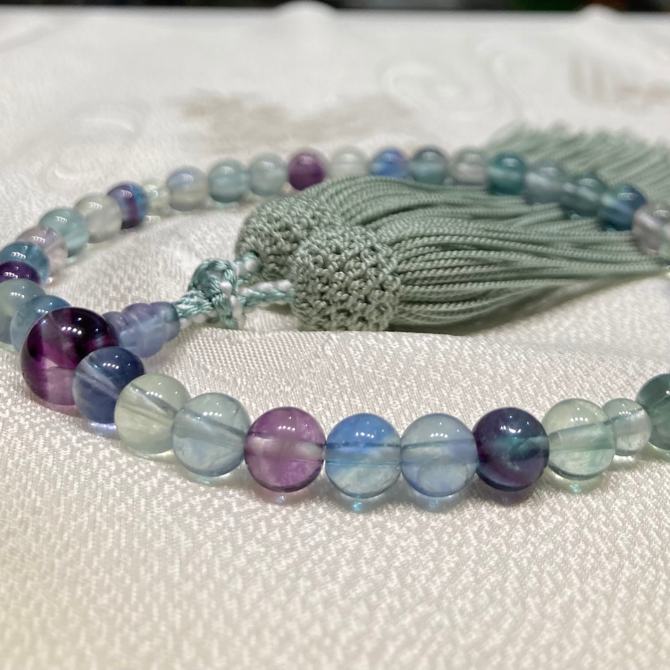 ホタル石 7ミリ 濃淡のグリーン、パープル、ピンク、いろいろな色をまばらに組んでおり、正絹房は薄いくすみグリーンで落ち着いた感じに仕上がっております。